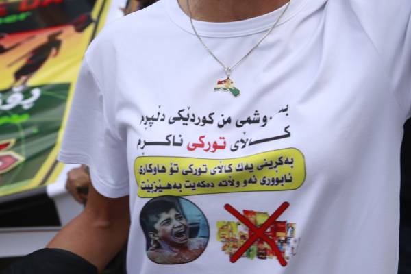 هاوڵاتیان بە دەنگی بەرزەوە دروشمەکانی بایکۆتکرنی شتومەکی تورکی دەڵێنەوە.